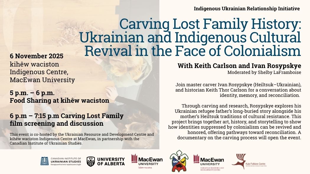 Join Heiltsuk-Ukrainian master carver Ivan Rosypskye and historian Keith Thor Carlson for a conversation about identity, memory, and reconciliation. Through carving and research, Rosypskye explores his Ukrainian refugee father’s long-buried story alongside his mother’s Heiltsuk traditions of cultural resistance. This project brings together art, history, and storytelling to show how identities suppressed by colonialism can be revived and honoured, offering pathways toward reconciliation. A documentary on the carving process will open the event.